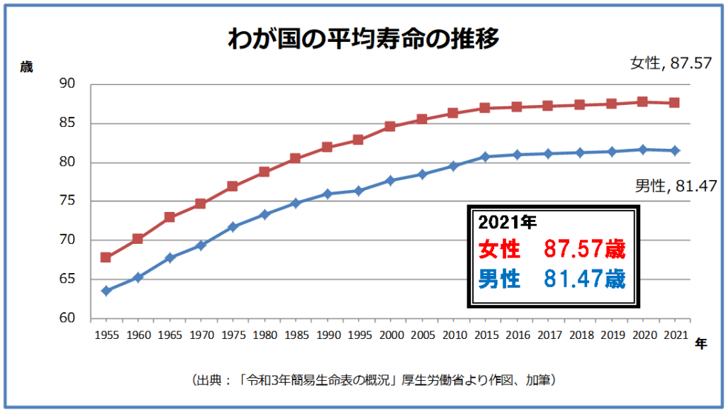 厚生労働省の「令和3年簡易生命表」によると、2021(令和2)年の日本人の平均 寿命は、男性は81.47歳、女性は87.57歳で、平均寿命自体は過去2番目に高い水準となった。