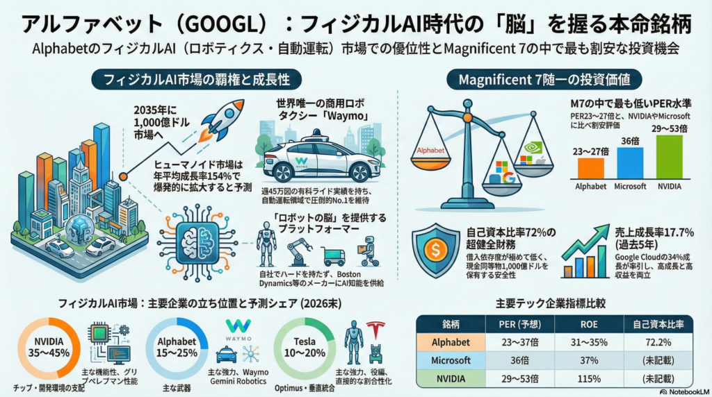 本記事では、投資家の視点からAlphabetを徹底分析します。財務指標、競争環境、フィジカルAI戦略、そしてバリュエーション。20の観点から、この銘柄が「今買うべきか」を検証していきます。
