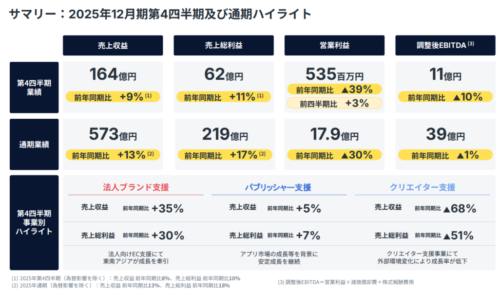 その一方で、会社が中長期の成長エンジンと位置づける法人ブランド支援事業の売上総利益は前年比+31.5%と力強く伸びた。Q4単独でも同+29.7%。中でもD2C/EC事業は通期で+48%、Q4に限れば+81%、法人向けEC支援だけを取り出すとQ4は前年同期比+162%という驚異的な成長率を記録している。