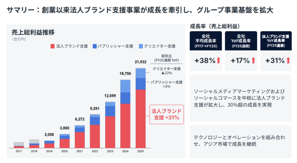 売上総利益の構成比も変化しており、2025年度は法人ブランド支援が全体の73%を占めるまでに拡大した。2024年度の65%からの急シフトだ。