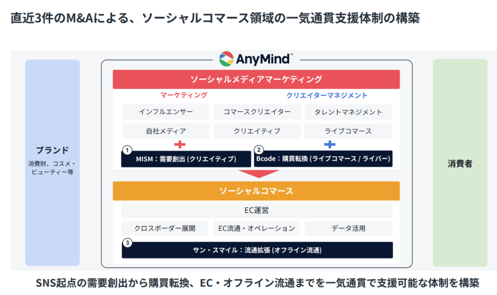 MISM(動画コンテンツ制作)→ AnyTag(インフルエンサー施策・SNS認知獲得)→ Bcode+AnyLive(ライブコマースでの購買転換)→ AnyX(EC運営・販売)→ AnyLogi(物流)→ サン・スマイル(オフライン流通・店頭販売)