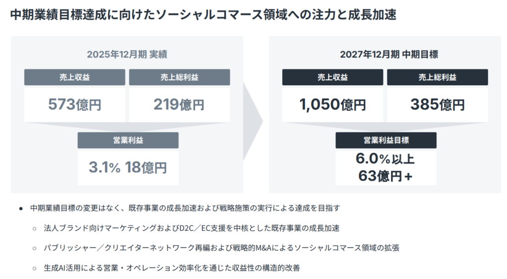 一方で、法人ブランド支援事業は売上総利益+31.5%、D2C/EC事業はQ4で+81%と加速し、収益構成の73%を占めるまでに成長した。3件のM&Aでバリューチェーンが完成し、SNS認知から店頭販売まで自社グループ内で完結できる体制が整った。この一気通貫のポジションを持つ競合は、今のところ存在しない。