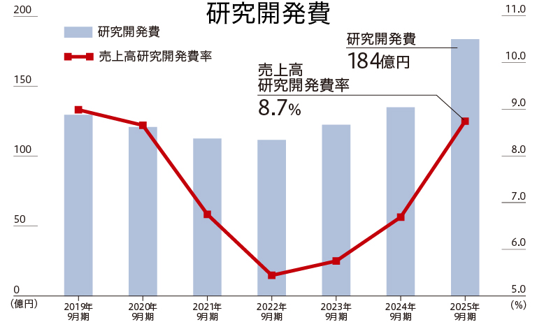 浜松ホトニクスは、製品開発のための研究だけでなく、光の本質を探究する基礎研究やそれに基づく応用研究にも力を注いでいます。2025年9月期の研究開発費は184億円で、売上高の8.7%を研究開発に投資しています。