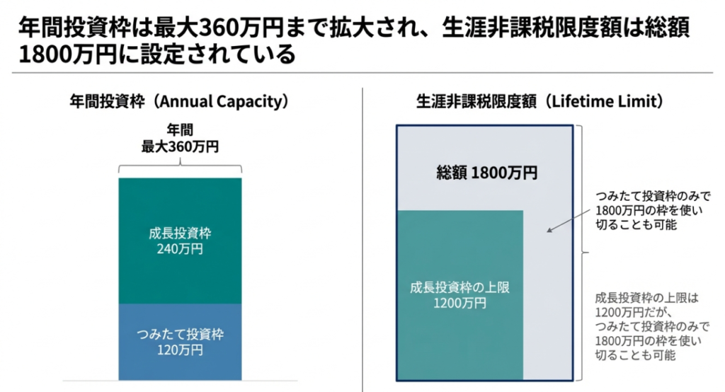 新NISAの生涯非課税保有限度額は1,800万円です。このうち成長投資枠で使えるのは1,200万円まで。つまり、つみたて投資枠だけで1,800万円を埋めることも可能ですし、成長投資枠を1,200万円、つみたて投資枠を600万円という配分も可能です。