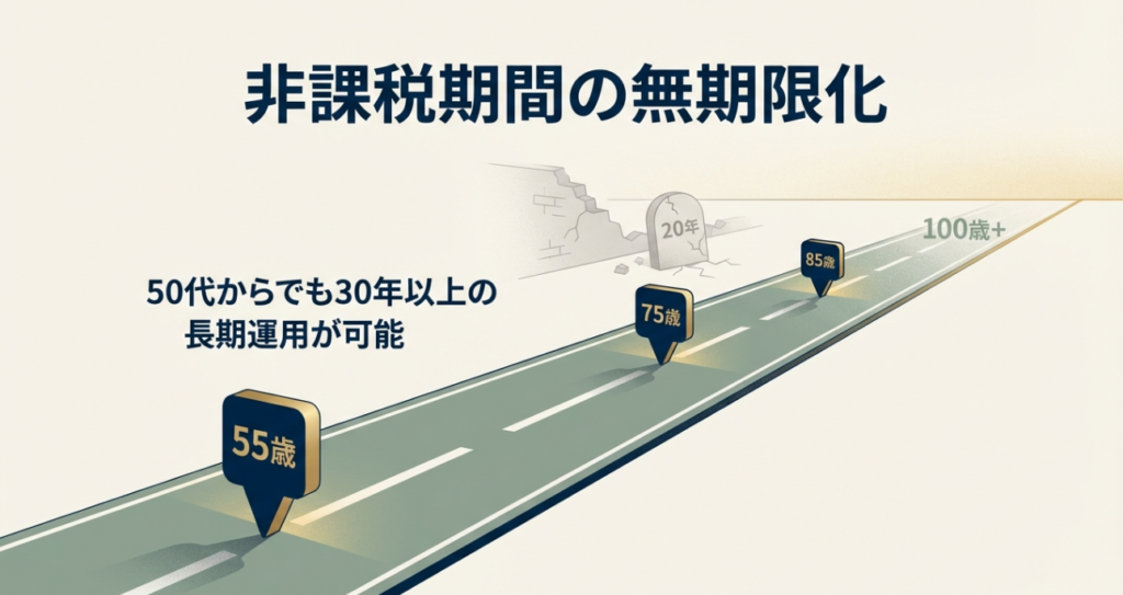 これは50代にとって非常に大きな変化です。仮に55歳から始めても、75歳、85歳と、生涯にわたって非課税で運用を続けられます。「50代からでは運用期間が短い」という懸念は、この制度改正で大きく解消されました。
